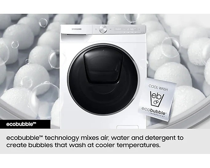 • EcoBubble™ Technology: Mixes air, water, and detergent to create bubbles that penetrate fabric quickly and remove dirt easily – even at low temperatures, ensuring efficient cleaning while saving energy.